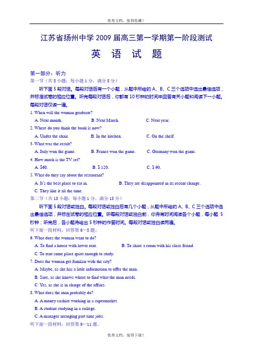 江苏省扬州中学2009届高三第一学期第一阶段测试英语试题第一部分:听力第一节(共5小题;每小题1分,满分5分)听下面5段对话。