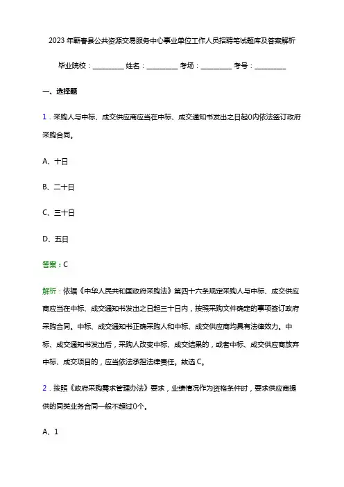 2023年蕲春县公共资源交易服务中心事业单位工作人员招聘笔试题库及答案解析毕业院校:__________ 姓名:__________ 考场:__________ 考号:__________一、选择题1.采购人与中标、成交供应商应当在中标、成交通知书发出之日起()内依法签订政府采购合同。
