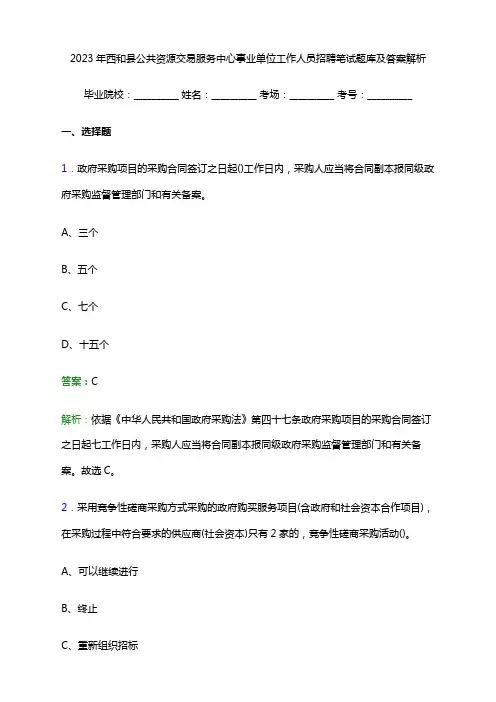2023年西和县公共资源交易服务中心事业单位工作人员招聘笔试题库及答案解析毕业院校:__________ 姓名:__________ 考场:__________ 考号:__________一、选择题1.政府采购项目的采购合同签订之日起()工作日内,采购人应当将合同副本报同级政府采购监督管理部门和有关备案。
