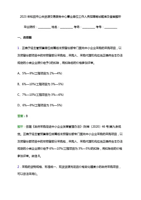 2023年和田市公共资源交易服务中心事业单位工作人员招聘笔试题库及答案解析毕业院校:__________ 姓名:__________ 考场:__________ 考号:__________一、选择题1.正确于经主管预算单位统筹后未预留份额专门面向中小企业采购的采购项目,以及预留份额项目中的非预留部分采购包,采购人、采购代理机构应当正确符合本办法规定的小微企业报价给予()的扣除,用扣除后的价格参加评审。