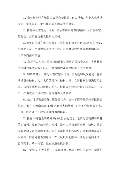 15、如果说松树在秋天里象征一个倔强的孩子的话,那么在冬天里,松树则是一个勇敢坚强的男子汉,它面对风雪严寒能够傲然挺立一个严冬而面不改色。