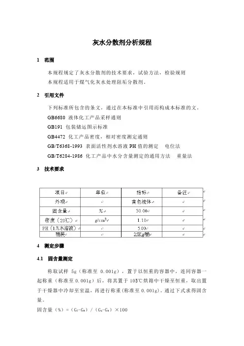 灰水分散剂分析规程1 范围本规程规定了灰水分散剂的技术要求,试验方法,检验规则本规程适用于煤气化灰水处理阻垢分散剂。