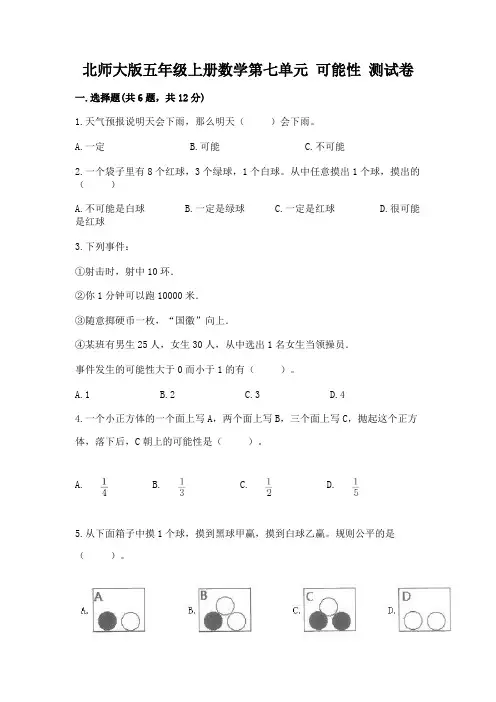 北师大版五年级上册数学第七单元可能性测试卷一.选择题(共6题,共12分)1.天气预报说明天会下雨,那么明天()会下雨。