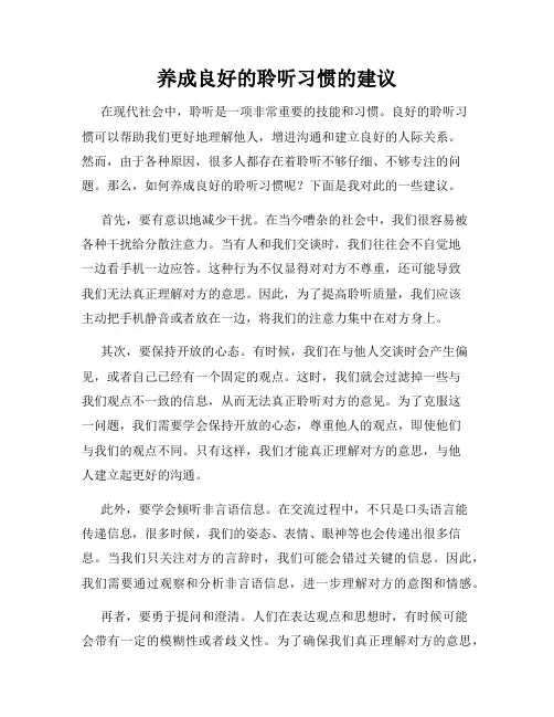 良好的倾听习惯包括:(1)在听别人说话时,不随意插嘴、打断他人讲话。