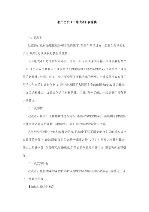 初中历史《土地改革》说课稿一、说教材过渡语:教材是连接教师和学生的纽带,在整个教学过程中起着至关重要的作用,所以,先谈谈我对教材的理解。