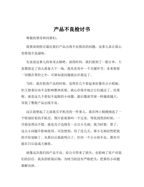 我对此深感自责,现将具体问题及检讨内容如下:一、问题概述近期,我负责的产品在销售过程中,陆续收到消费者反馈,反映产品存在以下问题:1. 产品功能不稳定,频繁出现死机、卡顿等现象;2. 产品外观存在瑕疵,部分产品出现变形、划痕等;3. 产品包装存在破损,导致产品在运输过程中受损。