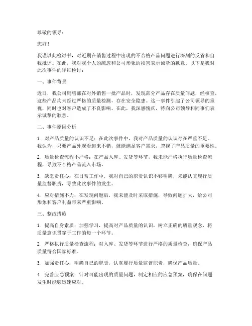 尊敬的领导:您好!我谨以此检讨书,对我近期负责供应的产品出现不合格问题进行深刻反省,并就相关责任进行严肃的自我批评。