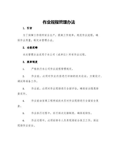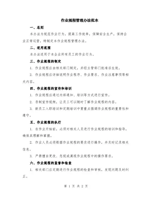 作业规程管理办法范本一、总则本办法为规范作业行为,提高工作效率,保障安全生产,保持企业正常运营,特制定本作业规程管理办法。