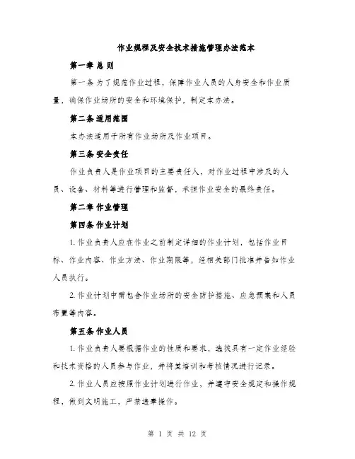 作业规程及安全技术措施管理办法范本第一章总则第一条为了规范作业过程,保障作业人员的人身安全和作业质量,确保作业场所的安全和环境保护,制定本办法。