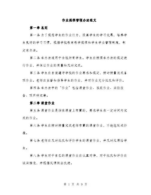 作业规程管理办法范文第一章总则第一条为了规范学生的作业行为,提高学生的学习效果,培养学生良好的学习习惯,根据学校教育教学规程和学生学业管理制度,制定本办法。