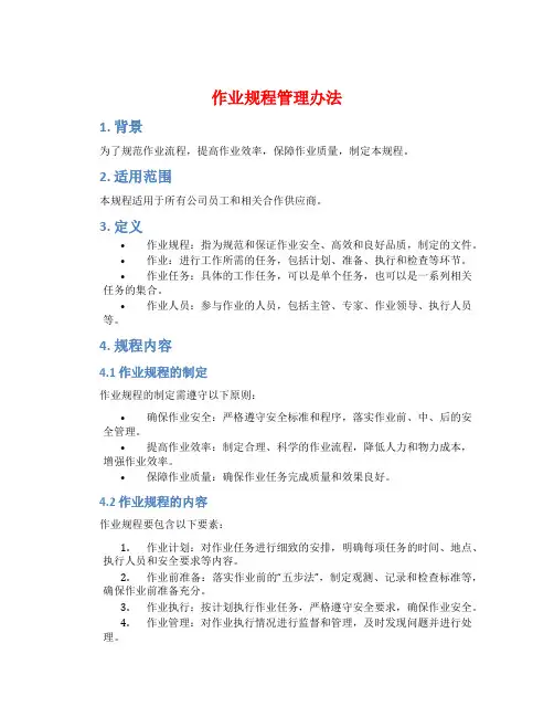 作业规程管理办法1. 背景为了规范作业流程,提高作业效率,保障作业质量,制定本规程。