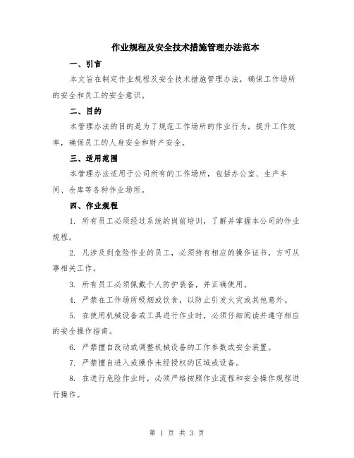 作业规程及安全技术措施管理办法范本一、引言本文旨在制定作业规程及安全技术措施管理办法,确保工作场所的安全和员工的安全意识。
