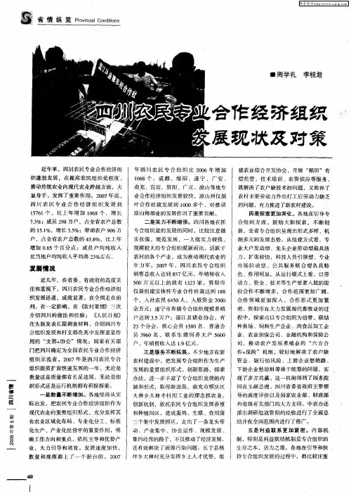 四川省第三批农民专业合作社省级示范社名单公告四川省第三批农民专业合作社省级示范社名单公告根据《四川省农民专业合作社省级示范社评选办法》的规定,由市县两级择优推荐,并经四川省农民专业合作社建设工作联席会议成员单位审查通过,决定评选郫县唐昌镇兴春蔬菜营销专业合作社等200家农民专业合作社为四川省第三批农民专业合作社省级示范社,现予公告:(排名不分先后)郫县唐昌镇兴春蔬菜营销专业合作社成都郫县天绿蔬菜专业合作社郫县唐昌镇战旗蔬菜专业合作社邛崃市大同榨菜专业合作社邛崃市金利猪业合作社双流牧马山蔬菜种植专业合作社双流县籍田果业专业合作社双流县大林镇椪柑种植专业合作社崇州市土而奇禽业专业合作社崇州市杨柳农民专业合作社大邑县大和红梅种植农民专业合作社都江堰市安龙蒲津家禽产业合作社都江堰市玉沿大葱农民专业合作社金堂县兴民生猪专业合作社成都市广兴齐辉果蔬专业合作社金堂县福丰农机专业合作社成都市温江区聚力花木生产营销专业合作社成都市龙泉驿区贵荣果业专业合作社成都龙泉灵泉山生态禽业专业合作社龙泉驿区山泉果业专业合作社蒲江县大塘双石茶叶专业合作社蒲江县加威猪业专业合作社彭州市康笑食用菌妇女农民专业合作社蒲江县云槐猕猴桃种植专业合作社成都市鑫锋农副产品专业合作社成都市蜀嫂蔬菜专业合作社成都市新津县宝山果业农民专业合作社成都市新都区兴华猪业专业合作社自贡市旭水河玉米专业合作社荣县鼎新镇双贵马铃薯种植专业合作社自贡市沿滩区立丰花椒专业合作社自流井区农团食用菌农民专业合作社盐边县烂坝蔬菜专业合作社米易县绿怡果蔬种植专业合作社攀枝花市亲农水果专业合作社攀枝花市东区安科枣专业合作社泸州市江阳区王咀蔬菜专业合作社泸州市龙马潭区新源家禽养殖专业合作社泸州纳溪牟新生态鸡养殖专业合作社泸县潮河龙眼专业合作社合江县大桥沙淤蔬菜专业合作社叙永县富康生态兔养殖专业合作社古蔺县绿色红粱专业合作社合江县彭家河荔枝专业合作社泸州市纳溪区民亿蚕桑专业合作社叙永县清凉洞糯稻种植专业合作社泸州市科牧生态农业专业合作社泸州市江阳区黄舣高粱专业合作社合江县龙聚蔬菜专业合作社泸县潮河镇州圆龙眼专业合作社广汉市南兴镇农胜花木专业合作社德阳市旌阳区双东镇东美枣种植专业合作社罗江县长荣水果专业合作社绵竹顺德食用菌种植专业合作社什邡市沿山猕猴桃专业合作社中江县宝源蚕业专业合作社中江县龙泉山石垭中药材专业合作社安县益昌薯类种植专业合作社绵阳市涪城区灵峰养鸡专业合作社江油市军创兔业养殖专业合作社江油市麻舒舒双椒生态种植专业合作社江油市大康镇星火村星花蔬菜农民专业合作社平武县南坝镇石坎核桃专业合作社平武县土城中药材种植专业合作社三台县立新镇科美蔬菜种植专业合作社三台县前锋丰凯蔬菜种植专业合作社绵阳市盐亭县良永生猪养殖专业合作社绵阳市万山柏林玫瑰专业合作社梓潼县靓绿瓜菜专业合作社北川羌族自治县禹羌绿宝猕猴桃农民专业合作社苍溪县陵江镇镇水蚕茧专业合作社广元市朝天区两河口惠农蔬菜专业合作社旺苍县五权镇清水茶叶专业合作社广元市天下鲜蔬菜专业合作社剑阁县元山镇瑞峰种植专业合作社苍溪县运山镇苍溪梨专业合作社苍溪县陵江镇农兴梨猕专业合作社安居区丰华农机专业合作社遂宁市安居永丰绿色五二四红苕专业合作社遂宁市船山区河梓田藕农民专业合作社遂宁市船山区永香农民专业合作社大英县回马镇滟湖蔬菜专业合作社大英县盛品甜橙种植专业合作社蓬溪县民富蔬菜专业合作社射洪县柠巨力柠檬专业合作社射洪县正果养殖专业合作社隆昌县昌林粮油农民专业合作社内江市东兴区怡心园种植专业合作社威远复立茶叶专业合作社资中县苏家湾镇佳宇芦柑农民专业合作社内江市东兴区红梁种植专业合作社乐山市双艺农业合作社犍为县和风生猪生产专业合作社沐川县一枝春茶叶专业合作社乐山市牛华芽菜专业合作社井研县林翔优质粮食专业合作社峨眉山市峨眉雪芽茶叶专业合作社马边彝族自治县白杨槽茶叶专业合作社夹江县龙园茶叶专业合作社峨边黑竹沟脱毒马铃薯专业合作社井研县藤椒专业合作社夹江县公阙农民专业合作社峨眉山市竹馨茶叶专业合作社峨边县玉芝茶叶产业专业合作社南部县联兴药材种植农民专业合作社南部县兴盛蚕业农民专业合作社南充市嘉陵区河西富华蔬菜专业合作社营山县春江果树种植专业合作社营山县东升葡萄科技开发专业合作社阆中市禾丰葛薯专业合作社阆中市龙兴生姜专业合作社蓬安县沈家坝水果专业合作社西充县竹娃娃麻竹农民专业合作社仪陇县茗军兔业农民专业合作社西充县红满天有机辣椒专业合作社南充市顺芦蛋鸡农民专业合作社珙县红欢堂粮油专业合作社高县胜天林下养殖专业合作社珙县玉龙黄金梨专业合作社江安县利民红粮专业合作社兴文县龙凤竹业专业合作社宜宾市翠屏区鸿鑫种植养殖专业合作社宜宾县领先茵红李专业合作社广安惠康蔬菜专业合作社广安市广安区兴安蚕业专业合作社广安益农蔬菜产销专业合作社华蓥市德嘉葡萄专业合作社邻水县双河脐橙专业合作社邻水县朱家寨柑桔专业合