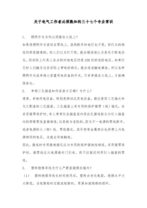 关于电气工作者必须熟知的三十七个专业常识1、照明开关为何必须接在火线上?如果将照明开关装设在零线上,虽然断开时电灯也不亮,但灯头的相线仍然是接通的,而人们以为灯不亮,就会错误地认为是处于断电状态。