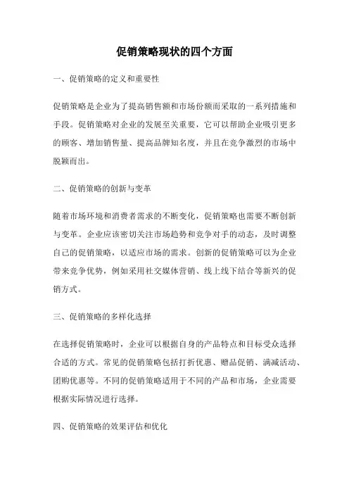促销策略现状的四个方面促销策略在现代商业领域中扮演着至关重要的角色,它是企业推动产品销售增长,赢得市场份额,增强竞争力的关键手段之一。