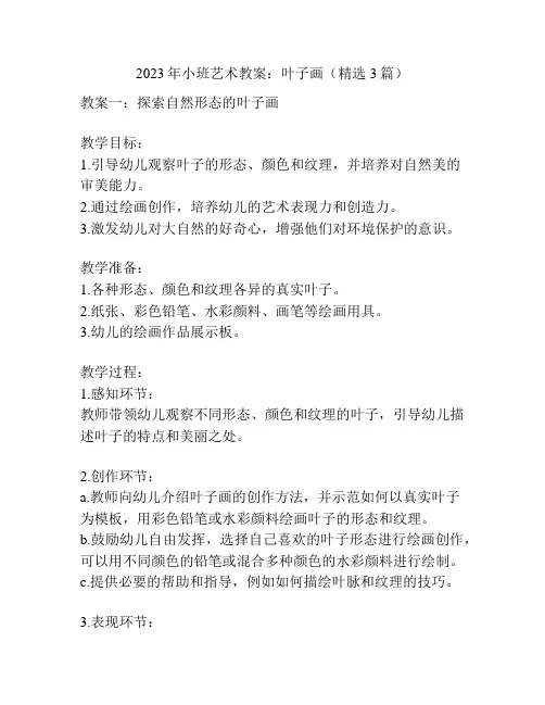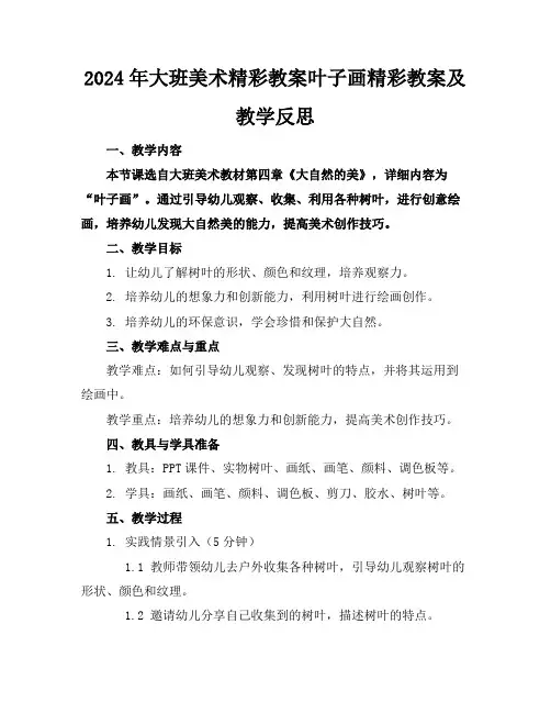 2024年大班美术精彩教案叶子画精彩教案及教学反思一、教学内容本节课选自大班美术教材第四章《大自然的美》,详细内容为“叶子画”。