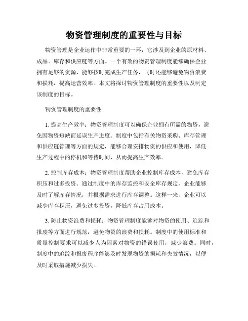 一、物资管理工作的意义1. 确保生产经营的顺利进行物资管理工作是企业生产经营的基础,为企业的生产提供必要的物资保障。