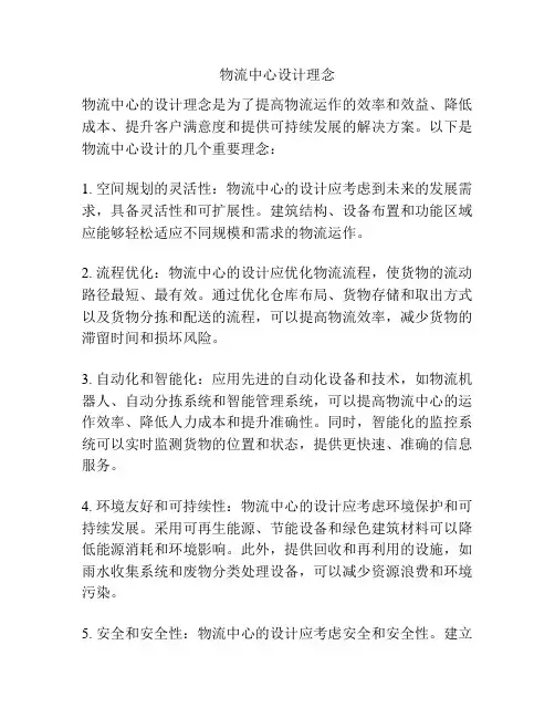 物流中心设计理念物流中心的设计理念是为了提高物流运作的效率和效益、降低成本、提升客户满意度和提供可持续发展的解决方案。