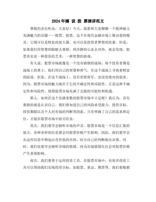 2024年嬉说股票演讲范文尊敬的各位听众,大家好!今天,我想和大家聊聊一个既神秘又充满魅力的话题——股票。