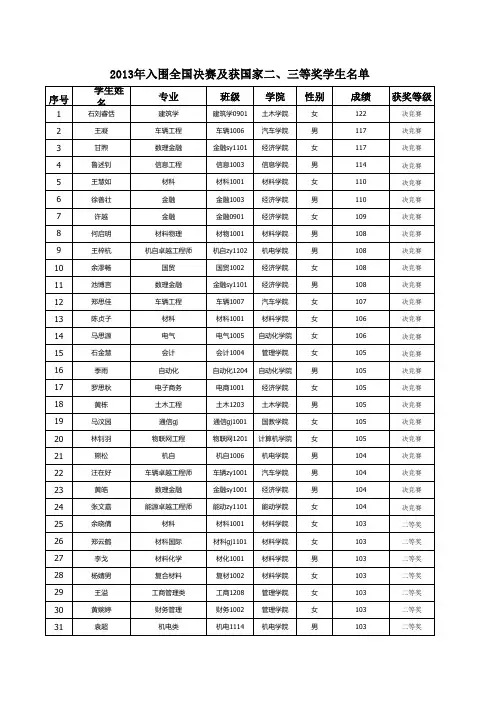 附件:自动化学院2005—2006学年学生院级.优秀个人、励志奖学金、单项奖学金名单1、院三好学生(164人)冻楠代平黄晶吴建辉黄璐王佩佩张超张凤娟冯柳舒清侯宏波田英江远罗琴沈夏王文星谭贤波胡冰心汪能覃晓凡张钦熊文付金谢玉蓝张瑞谢娜石薇岑海凤杨红胡雄鸽张兰霞陈明喜余晓光高志新汪旭祥詹东军王钰佘超常子奇乔彦涛徐旭田世兴叶家乐柳万华袁冬娥黄立磊金鹏孟军伟张北平李飞郭晓晶岳明杜朝王宇姜晨赵洋洋陈细栋邓华付俊波王丹李俊张磊李龙利李明珀陈素梅徐金云陈文荣吴锐何俊刘造杨波梁雪娇王勇王静思牛帅刘杰方源童程程陈超群周红杨芳朱乔尧王璞陆文佳袁卫星刘凯杨厦冯胜猛肖文方茜金淼鑫何利强贺磊覃贤体孙磊范琳丽吴正辉罗小兵陈辉谢金洲周军波李雅玲石华卿周超叶松王影曹峰山孟诚张晓琳蔡晓姝孙洪伟邵凯叶存奎司继涛黄少荣陈敏陈婷孟磊史贵林顾强周华徐梅生陈雨珩王丹丽赵正卿刘兰飞袁巍张懿梁昌财王晓婷赵垒梅智德蒙正寅吴雪熊婷鲁丹张巍王薇薇邱晓静李乐谷建金金辉李细根杜双育朱瑞林王菘波丁辉熊见林蔡望林马跃梁健蔡晓燕王振凯黄婷婷洪平刘清欣刘伟伟高臻董宛东谢鹏彭益媛曾逸先张强罗记达2、院优秀学生干部(41人)李子林赵雪松黄鹏彭长风吴鹏马龙邓臣卢锐李瑞芝高晔陈周程福焱朱天齐江慧宁龙堂程娟裴志勇宁浩金香莲赵嫚嫚何亮夏兵秀沈阳陈健李晶晶龚坤张博张月辉刘文刘文明王雄一徐啸李幸杨柳王猛毛攀峰杨志刚陶文珍汤利红赵晗冰向乐平3、励志奖学金(49人)杨兴平陈自彬鲁建邓绍伟赵树宗蒋志武朱三元李智侯宏波罗琴袁作威廖凌宵孙朝阳赵红林贾江涛雷辉陈余飞李文广宋冬胡石明孙全营巴进明陈超群李明波童辉孔军建李金保张智徐松林许庭婷韩存畴郭勇郑文文唐斌王建军陈科王婵娟顾芳周开文左江雷张华东舒克毅李学玲张革曹神抚吴超梁思曹庆元梁建辉4、单项奖(164人)社会工作奖(49人):谢涛纪传阳袁鹏程罗青华宋晓忠吴鹏程张新潘子超贺文婷李俊谢国民龙争争詹灯辉冯刚金香莲刘欢张迪立邓书莉刘莹魏震陈健李康宋昭冯继志陈晶晶王宸干继斌田甜陈少冬龚铖张也刘鑫王婉石珊李朋光未履伦迟永志郝世博宋杨洁张辉亚熊静慧郭海峰黄东旭何强余浩寻晓董昆仑方国敬宁岩精神文明奖(38人):王小念王冬青张婷鲁云星庞锴峰许岩方顺李卫山张明利谢兵李伟刘思远张缵龚俊周治武梁家宁何亮张亮邓海兵徐玲缓李真刚王冰朱尚隆吴澍丰杨金奎刘晓婧赵磊郑金英万斌赵高阳张海超秦福威范伟朱翠丽郝林伟于洋冉祥涛王瑞清学习进步奖(34人):陈维杨丹李智解震宇郑忠智廖凌霄刘学军徐海宏龙莉苹廖小松周良才于功琦王自朕刘志强张占江朱文博黎旭王丹范永昌万超冯火林皮海瑞董高成胡威吕浩然谢兆青米成王钢辉贾斌利许捷游雅玲金晨星闫世军黄富杰文体活动奖(43人):朱三元廖学龙张昭李鑫陈良安孙朝阳田世兴王伟权杨永森冯周围黄建明易平黄丽萍黄涛王珂李明波代永刚马金肖磊李志刚周生辉阮凯吴恒志祝广东陈辉卢炳明郭亚圣吴兆燕马永剑王诗文颜伟赵俊文沈成建胡文峰陈雪睿曹辉徐阿俊卞振东谭和海宛军校魏蔚胡希黄裕仁。