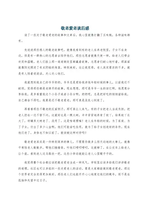 我真希望我们每个人都把身边的老人当作自己的长辈和亲人来对待,真诚地关爱他们,尽力地帮助他们,让我们的世界充满爱,让我们的社会更和谐,让我们的生活更美好!
