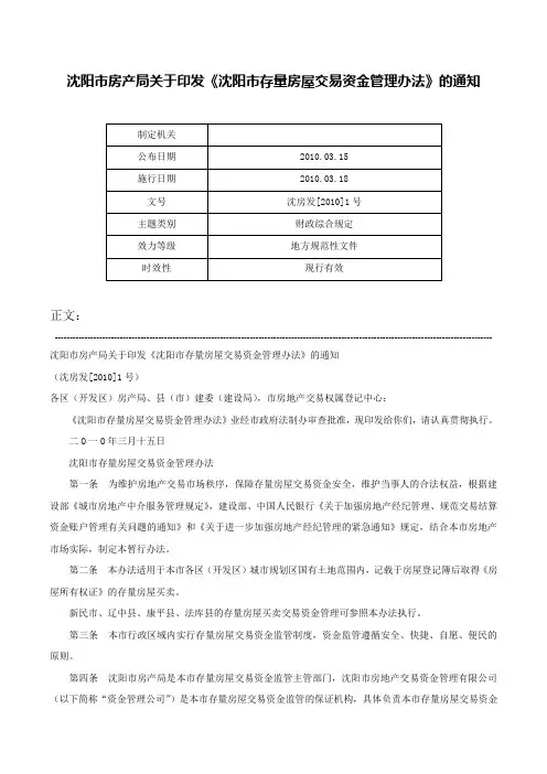 沈阳市房产局关于印发《沈阳市存量房屋交易资金管理办法》的通知正文:---------------------------------------------------------------------------------------------------------------------------------------------------- 沈阳市房产局关于印发《沈阳市存量房屋交易资金管理办法》的通知(沈房发[2010]1号)各区(开发区)房产局、县(市)建委(建设局),市房地产交易权属登记中心:《沈阳市存量房屋交易资金管理办法》业经市政府法制办审查批准,现印发给你们,请认真贯彻执行。