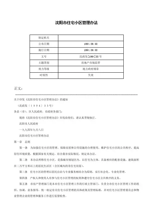 沈阳市人民政府一九九四年九月八日沈阳市住宅小区管理办法第一章总则第一条为加强住宅小区的管理,保障房屋和公用设施的合理使用,维护住宅小区的公共秩序,提高居住环境质量,根据国家有关规定,结合我市实际情况,制定本办法。