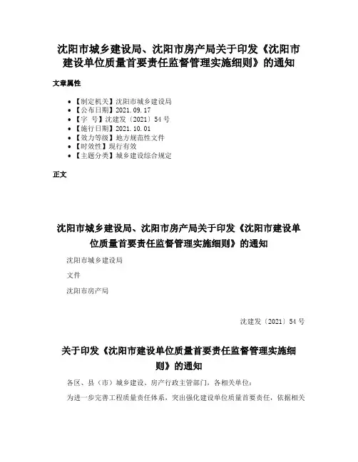 沈阳市城乡建设局、沈阳市房产局关于印发《沈阳市建设单位质量首要责任监督管理实施细则》的通知文章属性•【制定机关】沈阳市城乡建设局•【公布日期】2021.09.17•【字号】沈建发〔2021〕54号•【施行日期】2021.10.01•【效力等级】地方规范性文件•【时效性】现行有效•【主题分类】城乡建设综合规定正文沈阳市城乡建设局、沈阳市房产局关于印发《沈阳市建设单位质量首要责任监督管理实施细则》的通知沈阳市城乡建设局文件沈阳市房产局沈建发〔2021〕54号关于印发《沈阳市建设单位质量首要责任监督管理实施细则》的通知各区、县(市)城乡建设、房产行政主管部门,各相关单位:为进一步完善工程质量责任体系,突出强化建设单位质量首要责任,依据相关法律法规,结合我市实际,制定本实施细则,请认真执行。