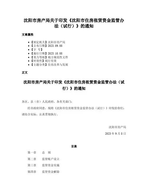 沈阳市房产局关于印发《沈阳市住房租赁资金监管办法(试行)》的通知文章属性•【制定机关】沈阳市房产局•【公布日期】2023.09.08•【字号】•【施行日期】2023.10.08•【效力等级】地方规范性文件•【时效性】现行有效•【主题分类】住房改革与发展正文沈阳市房产局关于印发《沈阳市住房租赁资金监管办法(试行)》的通知各区、县(市)人民政府,各有关部门:经市政府同意,现将《沈阳市住房租赁资金监管办法(试行)》印发给你们,请结合实际,认真贯彻执行。