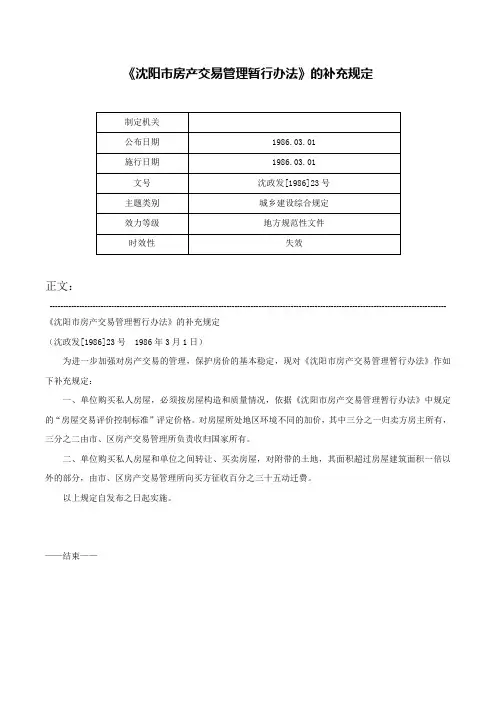 ---------------------------------------------------------------------------------------------------------------------------------------------------- 《沈阳市房产交易管理暂行办法》的补充规定