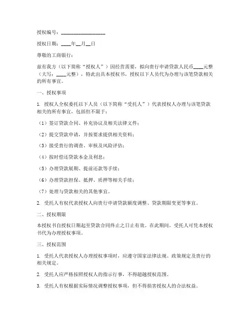 授权编号:__________________授权日期:____年__月__日尊敬的工商银行:兹有我方(以下简称“授权人”)因经营需要,拟向贵行申请贷款人民币____元整(大写:____元整),特此出具本授权书,授权以下人员代为办理与该笔贷款相关的所有事宜。