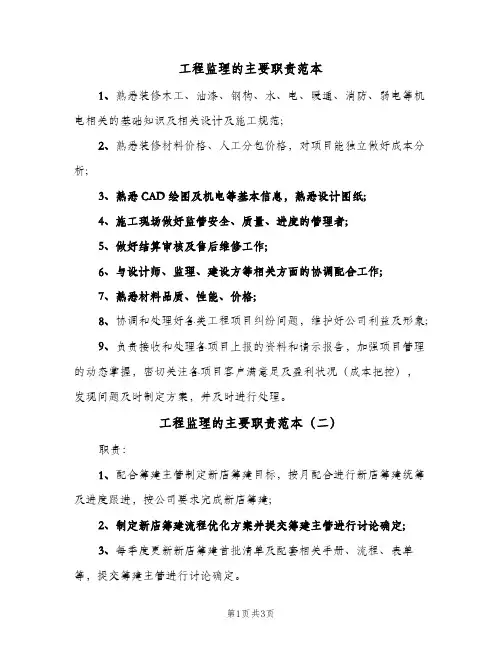 工程监理的主要职责范本1、熟悉装修木工、油漆、钢构、水、电、暖通、消防、弱电等机电相关的基础知识及相关设计及施工规范;2、熟悉装修材料价格、人工分包价格,对项目能独立做好成本分析;3、熟悉CAD绘图及机电等基本信息,熟悉设计图纸;4、施工现场做好监管安全、质量、进度的管理者;5、做好结算审核及售后维修工作;6、与设计师、监理、建设方等相关方面的协调配合工作;7、熟悉材料品质、性能、价格;8、协调和处理好各类工程项目纠纷问题,维护好公司利益及形象;9、负责接收和处理各项目上报的资料和请示报告,加强项目管理的动态掌握,密切关注各项目客户满意足及盈利状况(成本把控),发现问题及时制定方案,并及时进行处理。