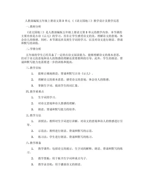 人教部编版五年级上册语文第3单元《语文园地三》教案设计及教学反思一、教学目标1. 知识目标•了解《语文园地三》这篇课文的主题和核心内容。