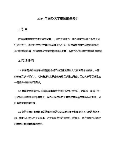 2024年民办大学市场前景分析1. 引言在中国高等教育快速发展的背景下,民办大学作为一种办学模式逐渐兴起并受到社会的关注。