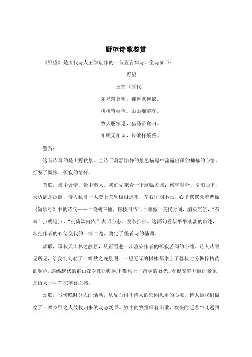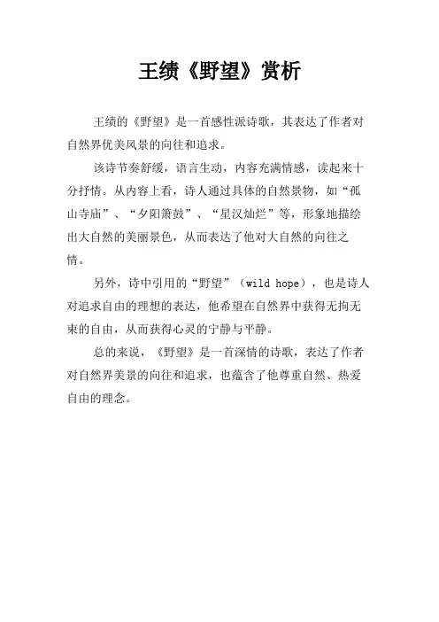 《野望》原文翻译及赏析关键信息项:1、《野望》原文内容2、翻译版本3、赏析要点4、作者背景介绍11 《野望》原文东皋薄暮望,徙倚欲何依。