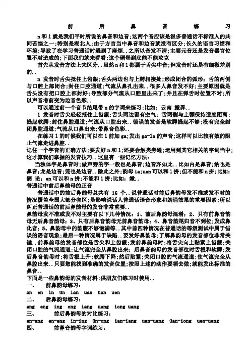 三、练习方法1. 仔细听录音或老师的示范,感受前鼻音和后鼻音的发音区别。