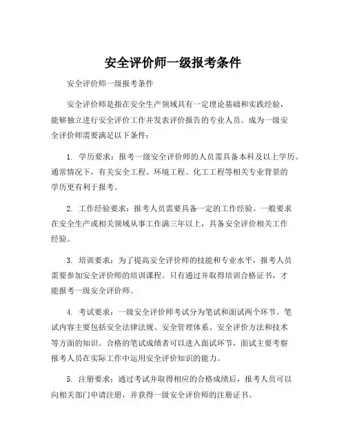 安全评价师一级报考条件安全评价师一级报考条件安全评价师是指在安全生产领域具有一定理论基础和实践经验,能够独立进行安全评价工作并发表评价报告的专业人员。