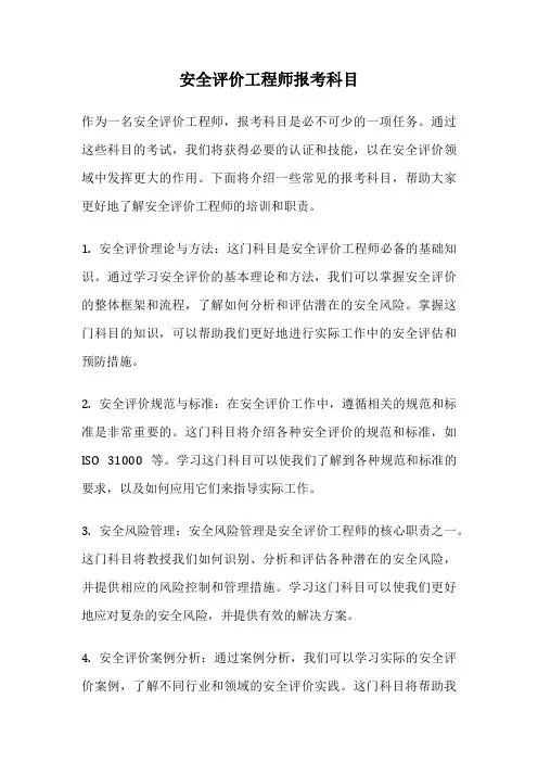 以上是一些常见的安全评价工程师报考科目,通过学习和掌握这些科目的知识和技能,我们将能够更好地履行安全评价工程师的职责,为保障人们的生命财产安全做出贡献。