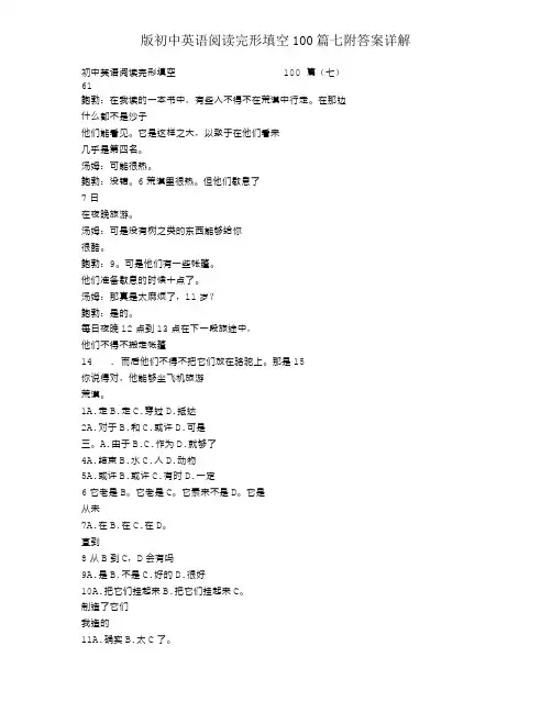 初中英语阅读完形填空100 篇(七)61Bob: In a book I was reading, some men had to1 a desert. There was nothing2sand they could see. It was so large3it seemed to them that it had almost no4.Tom: It5be very hot.Bob: That ’ sright.6hot in a desert. But they rested7the day and traveled at night..Tom: But there’ re no trees or anything like that8you to get cool.Bob:9 . But they had some tents (帐篷 ). They10when they were going to rest.Tom: That was a lot of trouble,11?Bob: Yes. Every night12they13 on the next part of the trip, they had to take the tents14 . Then they had to put them on their camels. That15way’s youthe can travel in adesert.1.A. go B. walk C. cross D. reach2.A. for B. and C. else D. but3.A. because B. that C. as D. enough4.A. end B. water C. people D. animals5.A. perhaps B. maybe C. sometimes D. must6.A. It always is B. It ’ s always C. It never is D. It ’ s never7.A. on B. at C. during D. until8.A. for B. to C. will D. have9.A. Yes B. No C. All right D. Very good10.A. put up them B. put them up C. made themD built them11.A. indeed B. too C. wasn ’ t itD. wasn ’ t that12.A. when B. after C. before D. when13.A. took B. got C. kept D. set out14.A. away B. down C. up D. on15.A. good B. first C. only D. strange62Mr. Miller had a shop in a big town. He1ladies clothes,’ and he always had two or three shop girls to2him. They were always3because they were cheaper than older women, but4of them worked for him for very5, because they were young, and they did not meet many boys in6shop.Last month a girl came to work for him. Her7was Helen, and she was very good.After a few days, Mr. Miller8 a young man come into the shop. He went9to Helen, spoke to her for a few10and then went out of the shop. Mr. Miller was very11 and when the young man12he went to Helen and said, “ Thatyoung man didn ’ t 13 anything. What did he want to14 ?”Helen answered,“ Hewanjusted to see15 . ”1. A. kept B. sold C. made D. mended2. A. learn B. teach C. help D. follow3. A. young B. strong C. clever D. boring4. A. many B. most C. neither D. none5. A. long B. much C. soon D. often6. A. children’B.smen ’ s C. clothes D. women ’s7. A. friend B. parent C. sister D. name8. A. realized B. guessed C. saw D. chose9. A. away B. straight C. back D. by10.A. words B. times C. things D. minutes11.A. nervous B. pleased C. surprised D. interested12.A. arrived B. left C. smiled D. finished13.A. buy B. try C. treat D. touch14.A. do B. take C. spend D. save15.A. money B. nothing C. me D. nobody63After her husband had gone to work, Mrs. Richards sent her children to school and wentupstairs to her bedroom. She was too1to do any housework that morning,2in theevening she was going to an interesting fancy dress party (化妆舞会 ) with her husband. What she3was a terrible genie ( 妖怪 ) and as she had made that special dress of hers the night before,she was anxious to try it on. 4 the dress was just a big piece of old cloth which was red,green, black and white, it would be very effective (有效的 ) to make her like a real genie. Afterputting it on, Mrs. Richards went downstairs happily. She wanted to find out5it would becomfortable to wear.Just as Mrs. Richards was entering the dining-room there was a 6at the door. Shethought that it7be the baker ( 面包师 ). She had told him to come straight in if she8to open the door and leave the bread on the kitchen table. Now not wanting to9the poorman, Mrs. Richards quickly10in the small storeroom under the stairs. She heard the frontdoor open and a man came in. When Mrs. Richards11that it was the man from theelectricity board (供电局 )who had come t o read the meter (电表 ), she walked out of thehiding- place on a sudden and tried to explain the matter, saying with a smile,12! It“ It ’ s only is not13for you to be14! ” But it was too late. The man letout a sharp cry ( 发出尖叫 )and jumped back several paces ( 步 ) . Then he ran away,15the door behind him with greatforce and noise.1. A. angry B. ready C. frightened D. excited2. A. for B. but C. so D. and3. A. wanted to see B. wanted to play C.was afraid to seeD. was afraid to play4. A. Though B. But C. And D. If5. A. that B. how C. whether D. when6. A. knock B. voice C. man D. baker7. A. may B. must C. wouldn’ t D. couldn’t8. A. not B. had C. tried D. failed9. A. see B. frighten C. help D. scold ( 责备 )10.A. went B. lay C. appeared D. hid11.A. thought B. wondered C. imagined D. realized12.A. me B. you C. game D. play13.A. good B. necessary C. late D. early14.A. off B. here C. afraid D. sorry15.A. pushing B. locking C. knocking D. shutting64Last Tuesday I took my two daughters, aged five and seven, to town by car. It began to rain 1so I decided I would leave the children in the car before I went quickly into a shop. I2 the girls not to touch anything and told them I would be3within a few minutes. Then I locked all the doors and left 4 happily looking out of the window.I returned to the car in less than five minutes but the girls had disappeared! I could hardly believe my5. The car doors were6locked, the windows were shut and on the back seat7only two coats. Being8, I ran to the corner of the street 9there was no 10of them .I rushed up to an old lady nearby and asked11 she had seen two small girls but she said “ No”Feeling. quick sick with fear, I sat on the driver ’seat, and12 to stop trembling. Suddenly, I13 a merry laugh behind me. I got out of the car, ran round to open the boot and there inside were two very red-faced and excited14 . They had obviously pulled out the back seat,15behind it and then been unable to push the seat forward again. With tears in my eyes, I leaned forward and pulled their ears.1. A. heavy B. hard C. hardly D. big2. A. let B. warned C. allowed D. repeated3. A. away B. out C. back D. alone4. A. them B. her C. themselves D. herself5. A. ears B. words C. eyes D. brains6. A. too B. again C. already D. still7. A. there B. sat C. seen D. were8. A. exci