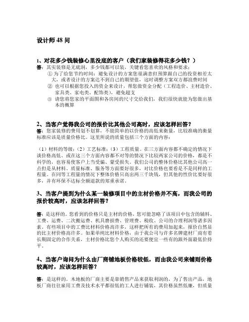 设计师48问1、对花多少钱装修心里没底的客户(我们家装修得花多少钱?)答:其实装修是无底洞,多少钱都可以装,关键看您喜欢的风格和要求;①为了给您节约时间:避免设计的方案您很满意但预算跟自己的投资相差太大,或者设计的方案达不到自己的期望值,这时调整方案双方都浪费时间②也可以根据您投入的资金来设计,帮您做资金分配(工程造价、主材造价、家具类、家电类、配饰类),避免超支③请您将您家的平面图和各房间的尺寸交给我们,我们很快就能为您做出基本的概算2、当客户觉得我公司的报价比其他公司高时,应该怎样回答?答:您家装修的费用划不划算,不能简单的以价格的高低来衡量,比较准确的衡量标准应该是质量价格比。