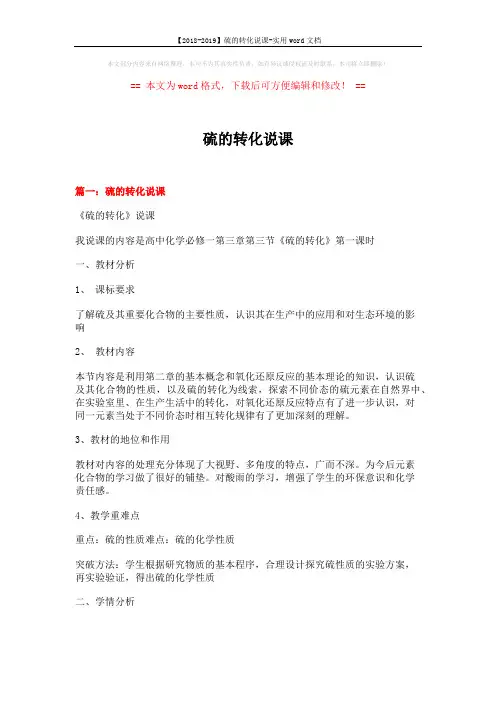 硫的转化教案一、教学目标:1.了解硫的性质及其在自然界和工业中的应用;2.掌握硫在化学反应中的转化规律;3.能够运用所学知识解决与硫相关的问题。