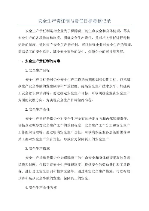 六、总结公司安全生产责任制及责任目标考核制度是为了保障公司员工的生命安全和财产安全而制定的,其中包括安全生产责任制的要求、责任目标的设定、责任主体的职责和考核方法等内容。