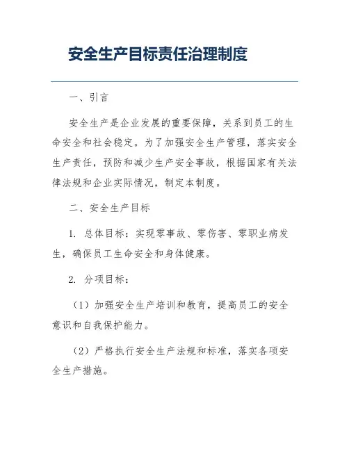 安全生产目标责任治理制度一、引言安全生产是企业发展的重要保障,关系到员工的生命安全和社会稳定。