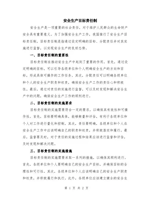 四、安全生产目标责任制的实施1. 企业应根据安全生产目标,制定具体的实施方案,明确责任人和责任期限。