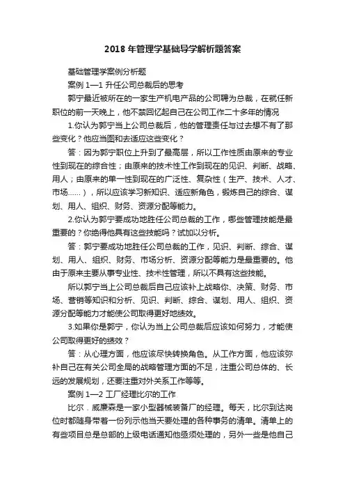 2018年管理学基础导学解析题答案基础管理学案例分析题案例1—1 升任公司总裁后的思考郭宁最近被所在的一家生产机电产品的公司聘为总裁,在就任新职位的前一天晚上,他不禁回忆起自己在公司工作二十多年的情况1.你认为郭宁当上公司总裁后,他的管理责任与过去想不有了那些变化?他应当图和去适应这些变化?答:因为郭宁职位上升到了最高层,所以工作性质由原来的专业性到现在的综合性;由原来的技术性工作到现在的见识、判断、战略、用人;由原来的单一性到现在的广泛性、复杂性(生产、技术、人才、市场……),所以应该学习新知识、适应新角色,锻炼自己的综合、谋划、用人、组织、财务、资源分配等能力。