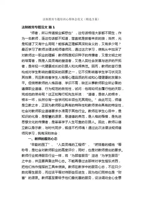 法制教育培训心得体会(集锦15篇)法制教育培训心得体会1经过一学期的努力学习,对学科渗透法制教育有了初步的认识,为了更好地实施好学科渗透法制教育,现在将个人心得如下:一、有意。