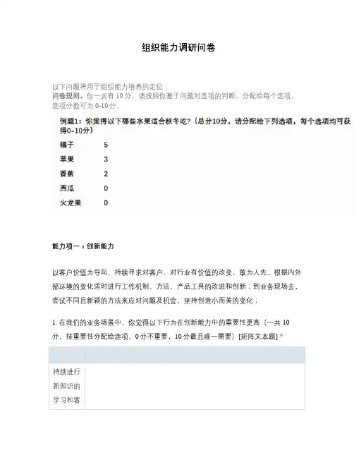 组织能力调研问卷以下问题将用于组织能力培养的定位;问卷规则,你一共有10分,请按照你基于问题对选项的判断,分配给每个选项,选项分数可为0-10分。