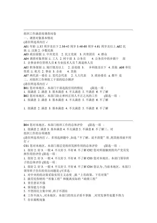 组织工作满意度调查问卷一、调查对象基本情况(请在所选项内打√A01 年龄 :1.35 周岁及以下 2.36-45 周岁 3.46-60 周岁 4.61 周岁及以上 A02 民族 :1. 汉族 2. 少数民族A03 政治面貌 :1. 中共党员 2. 民主党派 3. 共青团员 4. 群众A04 调查对象类别 :1. 工人 2. 村干部 3. 公务员 4. 公务员中的乡镇干部5.企事业单位管理人员6.专业技术人员7.离退休人员A05 职务级别 :1. 地厅级及以上 2. 县处级 3. 乡科级及以下 4. 其他 A06 单位性质 :1. 机关 2. 事业 3. 企业 4. 其他A07 两代表一委员 :1. 党代会代表 2. 人大代表 3. 政协委员 4. 都不是二、对组织工作和组工干部的综合测评(请在所选项内打√B01 您对本地区、本部门干部选拔任用的情况(限选一项 :1.很满意2. 满意3. 基本满意4. 不太满意5. 不满意6. 不了解B02 您对本地区、本部门防止和纠正用人不正之风的工作(限选一项:1.很满意2. 满意3. 基本满意4. 不太满意5. 不满意6. 不了解1.很满意2. 满意3. 基本满意4. 不太满意5. 不满意6. 不了解B04 您对本地区、本部门组织工作的总体评价(限选一项:1.很满意2. 满意3. 基本满意4. 不太满意5. 不满意6. 不了解三、对组织工作的分项调查(请在所选项内打√。