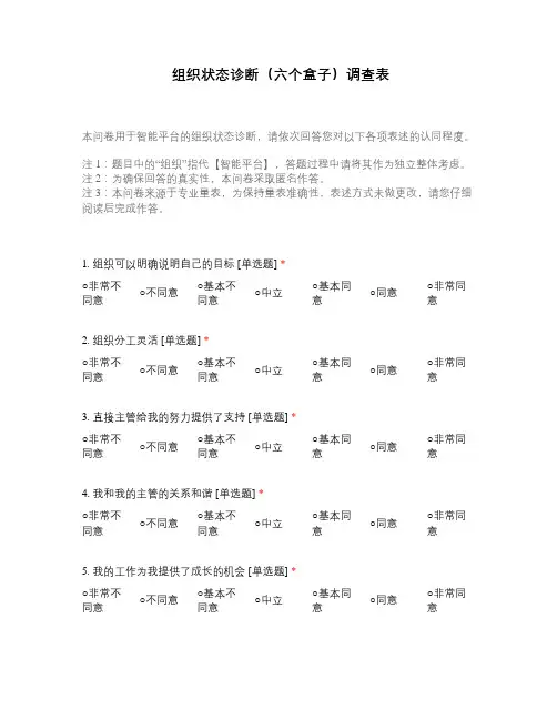 组织状态诊断(六个盒子)调查表本问卷用于智能平台的组织状态诊断,请依次回答您对以下各项表述的认同程度。