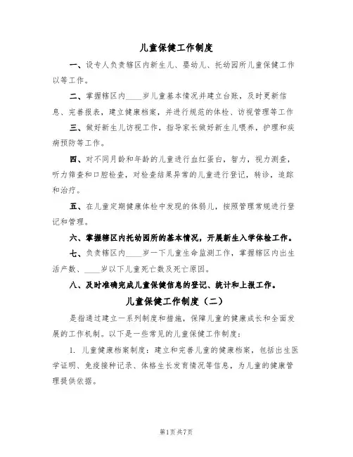 以下是儿童保健工作制度的内容:一、儿童保健工作原则1. 全面规划,突出重点。